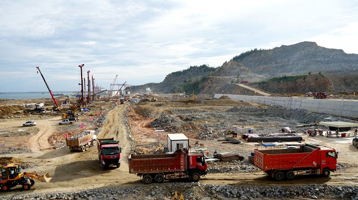 博賀新港區(qū)建設(shè)現(xiàn)場(chǎng)往來工程車輛川流不息,工地人員各司其職,各項(xiàng)工序有條不紊,處處展現(xiàn)出一派熱火朝天的建設(shè)景象。
