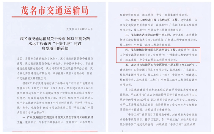 2月2日,茂名市交通運(yùn)輸局下發(fā)《茂名市交通運(yùn)輸局關(guān)于公布2022年度公路水運(yùn)工程市級(jí)“平安工地”建設(shè)典型項(xiàng)目的通知》文件,對(duì)2022年度公路水運(yùn)工程平安工地建設(shè)成效突出的項(xiàng)目進(jìn)行表彰通報(bào)。集團(tuán)建設(shè)的茂名港博賀新港區(qū)東區(qū)油品碼頭工程獲評(píng)“平安工地”稱號(hào),這已是油品碼頭工程連續(xù)3年榮獲該項(xiàng)榮譽(yù)。