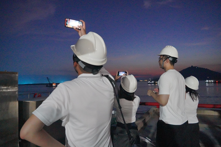 游戲結(jié)束后,大家走進了集團碼頭庫區(qū)泊位,直觀感受港區(qū)碼頭的宏偉氣勢,親眼目睹了正在建設(shè)的30萬噸級原油碼頭工地忙碌景象,欣賞了港灣的夕陽美景。通過現(xiàn)場參觀,大家對茂名港集團的發(fā)展歷程、生產(chǎn)建設(shè)、企業(yè)文化有了更深刻的了解。