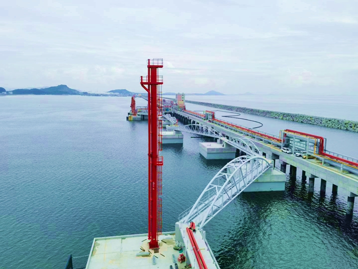 此次安裝的4臺(tái)裝卸臂堪稱碼頭“大動(dòng)脈”,每臺(tái)高23.3米、重41.83噸,采用電/液驅(qū)動(dòng)技術(shù),具備高效、安全、穩(wěn)定的輸油能力,全部投用后,每年可助力完成1650萬(wàn)噸原油輸送任務(wù),將大幅提升茂名港原油接卸與中轉(zhuǎn)效率。同步安裝的具有浮動(dòng)功能的登船梯高26.5米、重約32噸,根據(jù)潮汐自動(dòng)調(diào)節(jié)梯高度的智能設(shè)計(jì),為10萬(wàn)到30萬(wàn)噸級(jí)的船舶提供了安全便捷的通道;2座高29米的消防炮塔上的消防水炮最大覆蓋半徑達(dá)99米,其射程遠(yuǎn)、流量大,如同“安全衛(wèi)士”構(gòu)筑起碼頭前沿的安全保障網(wǎng)。