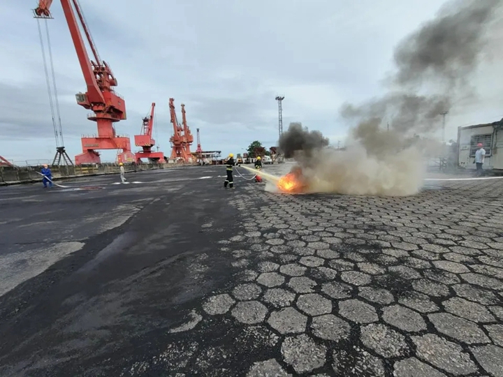 港口經(jīng)營公司開展港口設(shè)施保安暨碼頭消防綜合應(yīng)急演練,模擬裝船作業(yè),因有疑似恐怖分子從海上手持兇器強(qiáng)行登陸實(shí)施縱火,演練人員迅速響應(yīng),配合默契,開展消防滅火、搶險(xiǎn)救援、港口設(shè)施保安、防海洋環(huán)境污染、醫(yī)療及后勤等應(yīng)急處理。