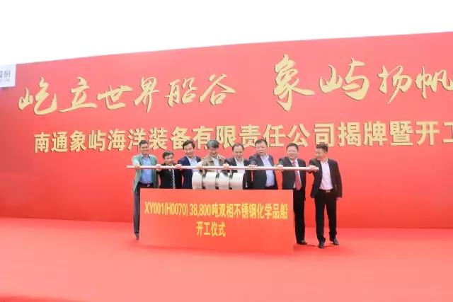 首制船“XY001”號38800噸不銹鋼化學(xué)品船同期開工。江蘇省經(jīng)信委副主任、國防科工委主任秦雁,南通市委常委、通州區(qū)委書記宋樂偉,南通市副市長徐新民,通州區(qū)區(qū)委副書記、區(qū)長陳永紅,華融航運金融租賃有限公司總經(jīng)理樊旭平,象嶼集團總裁陳方,中海重工董事局主席李明,南通象嶼副董事長朱建華,共同推動38800噸不銹鋼化學(xué)品船開工桿!